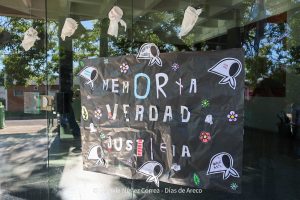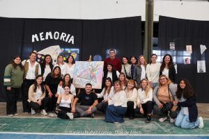 El patio de la escuela estuvo especialmente ambientado con producciones de los estudiantes bajo la consigna de memoria, verdad y justicia y hasta una línea de tiempo que repasaba los hechos desde principios de los 70 hasta la actualidad.