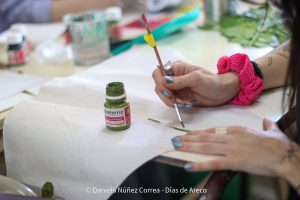 Arrancando la jornada, Isabel Centurión ofreció un nuevo taller de reservas y amarras sumando el uso de tintes naturales para trabajar con la técnica japonesa de teñido shibori. En esta ocasión, los participantes trabajaron con cáscaras de cebolla para colorear las telas en tonos ocre.
