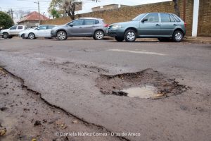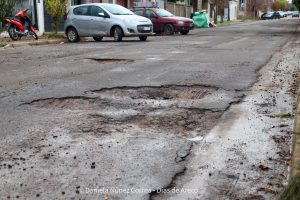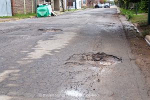 La calle Del Valle, desde Mitre hacia la costanera, quedó minada de pozos tras la inundación. Esas tres cuadras ya estaban en mal estado antes de la crecida, pero con el agua que se acumuló durante varios días, terminaron de detonarse.