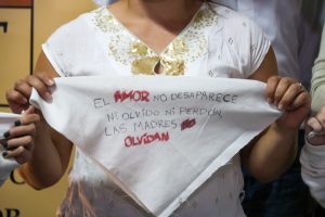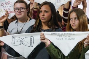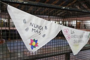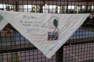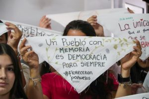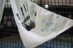 Para completar el acto, se repartieron algunos de los pañuelos intervenidos entre los presentes para una foto. Muchos de ellos llevaban consignas como “Florecerán pañuelos”, “La memoria no se toca”, “Nunca Más”, “Un pueblo con memoria es democracia para siempre” y “Sembrar la memoria para que no crezca el olvido”.