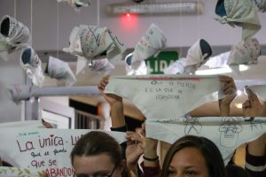 En el hall de ingreso al Instituto se reunieron no solo estudiantes de todas las carreras sino que también fueron invitados alumnos del turno vespertino de la Secundaria 1 (ex Colegio Nacional) que funciona en el mismo edificio. Para darle marco al acto, distintas versiones del clásico pañuelo blanco de Madres y Abuelas.