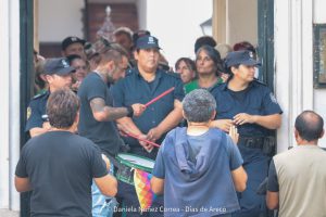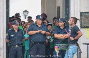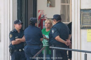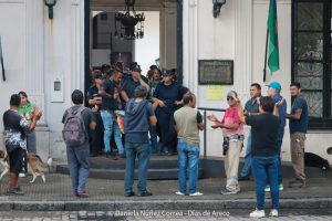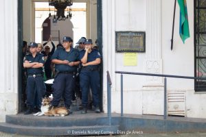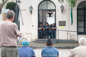 Esta mañana otra vez se puso en marcha un fuerte operativo de seguridad con efectivos de la Comunal y del GAD que ante la atente mirada del Comisario Víctor Pacheco cercaron el ingreso a la Municipalidad, tanto por la puerta principal de la calle Lavalle como por el patio trasero. Muchos manifestantes habían ingresado al viejo edificio antes de que llegaran los uniformados y permanecieron dentro hasta cerca del mediodía.