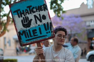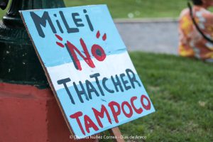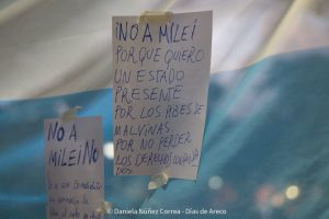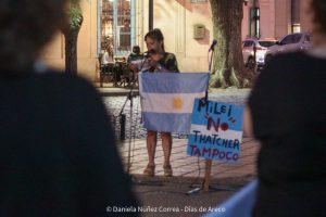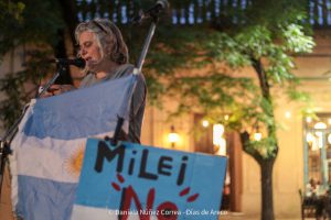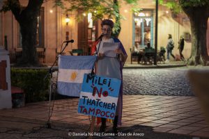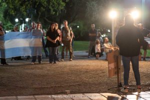 Con el micrófono abierto se realizaron llamados a defender la soberanía sobre Malvinas, a frenar la violencia, en especial hacia mujeres y diversidades y a defender los derechos humanos y repudiar los delitos de lesa humanidad tras los dichos negacionistas Milei y diversos dirigentes de su espacio, que niegan los 30.000 desaparecidos y el terrorismo de Estado.