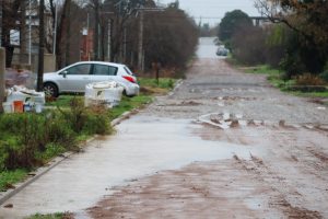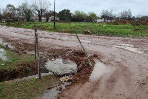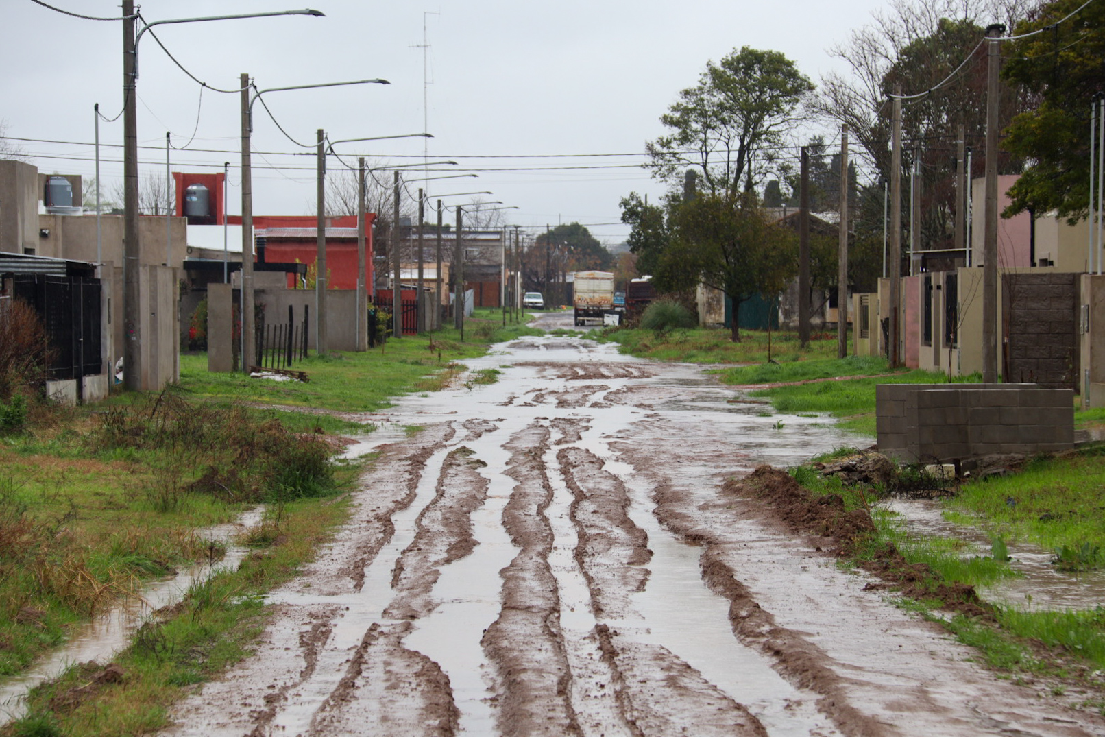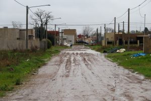 En el Barrio Irazú la situación es similar. Si bien la gestión Ratto hizo el cordón cuneta, la obra dejó inconvenientes en los niveles de las casas en comparación con las calles y recién hace unos días se empezó a colocar algún tipo de mejorado tras años de insistencia de los vecinos. Pero hay algo más que llamativo: las piedritas llegan ahora hasta mitad de cuadra por Burgueño llegando a Durán. Terminan justo donde ya no hay más casas pero sí está la obra abandonada del Centro de Desarrollo Infantil.