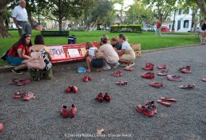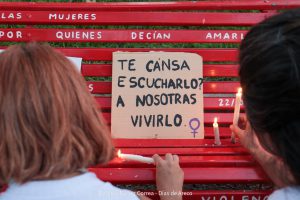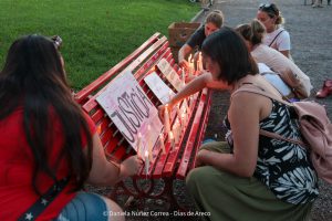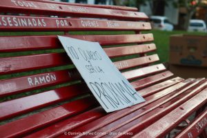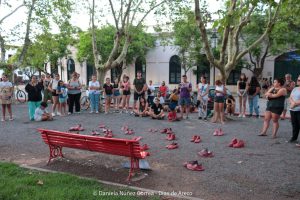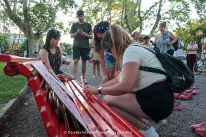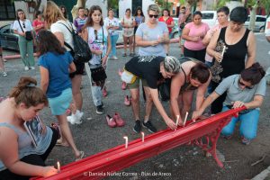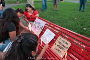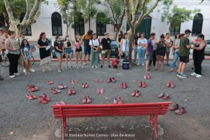 Ya en la plaza, el banco rojo se convirtió una vez más en una especie de altar cívico: se encendieron velas, se dejaron carteles con consignas en contra de la violencia de género y pidiendo justicia por las víctimas. La instalación artística zapatos rojos, inspirada en la obra de Elina Chauvet y que recuerda a las mujeres que ya no están debido a la violencia de género, volvió a rodear el banco rojo.