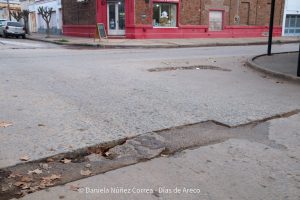 Ya cruzando Vieytes, las ya históricas acumulaciones de agua tampoco tienen solución y el asfalto se va degradando y generando nuevos baches. Todo esto en una esquina de importante tránsito, en el corazón de una de las zonas comerciales más concurridas del pueblo después de la calle Alsina. Otra vez, la falta de mantenimiento y cuidado del pueblo es evidente.