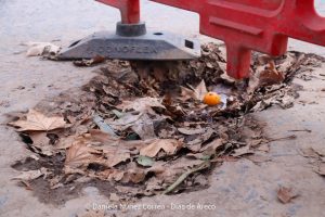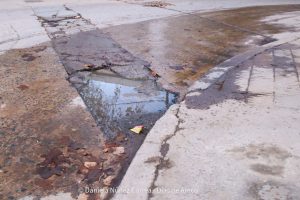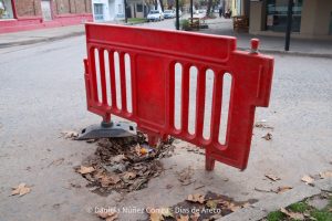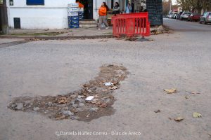 Hace más de un mes hay una valla plástica que quedó puesta después de que Sanear arreglara una pérdida de agua en la esquina. Señaliza un poco profundo, que se fue llenado de hojas y suciedad y que por momentos queda destapado porque la valla se cae o se corre de lugar. Las otras intervenciones por problemas de agua quedaron directamente sin tapar ni señalizar y no ha habido hasta ahora ningún intento de bacheo o mejora.