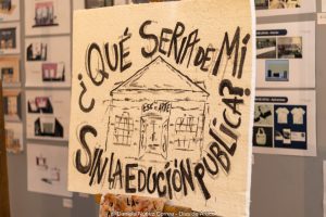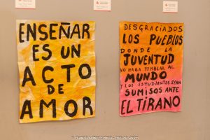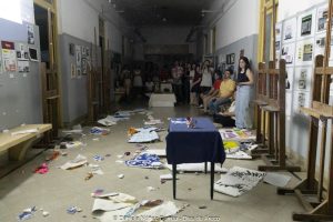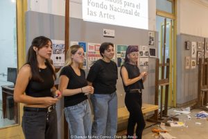 Además, alumnas de la materia artes combinadas del cuarto año del profesorado de artes visuales hicieron una performance sobre el recorte que están sufriendo las artes y la educación a nivel nacional. Malena López, Sofía Reynoso, Ángeles Rodríguez y Daniela Espinel proyectaron un video con titulares sobre el ajuste y, en una intervención furiosa, destruyeron carteles, piezas de cerámica y pinturas representativas de las artes. Terminaron la performance repartiendo mensajes en defensa del arte y la educación entre los presentes.