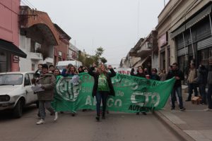 Cerca de las 10:30 horas los trabajadores se movilizaron con bombos, banderas y pancartas hasta la Municipalidad. Primero ingresaron al patio del viejo edificio de la calle Lavalle y luego marcharon por las calles Alsina, Alvear y Arellano con dos paradas en el camino: en el Concejo Deliberante y en el cruce de Alsina y Alem. Por momentos la columna, integrada por unas 70 personas, interrumpió la circulación del tránsito en la zona comercial de la ciudad y le entregaron volantes a los vecinos con copias de sus recibos de sueldo. Finalmente regresaron al hospital, que es el punto base de la protesta.